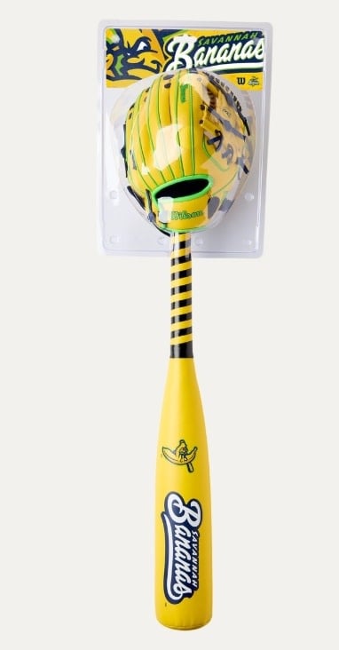 A bundle of fun, all in one. This glove, ball and bat kit includes an A200™ EZ Catch™ Savannah Bananas 10” T-Ball Glove, along with a cotton-stuffed ball and foam bat.