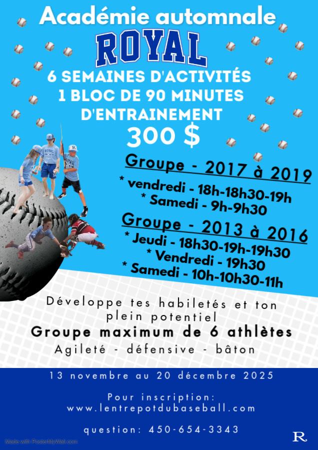 Session de l'Académie automnale de baseball du Royal débutant la semaine du 13 novembre 2025. Programme d'entrainement complet de 6 semaines de formation thématique de 90 minutes d'entrainement par semaine. 3 blocs de 30 minutes qui amènera le joueur à travailler différents éléments techniques durant la phase de retour progressif à l'entrainement automnal.